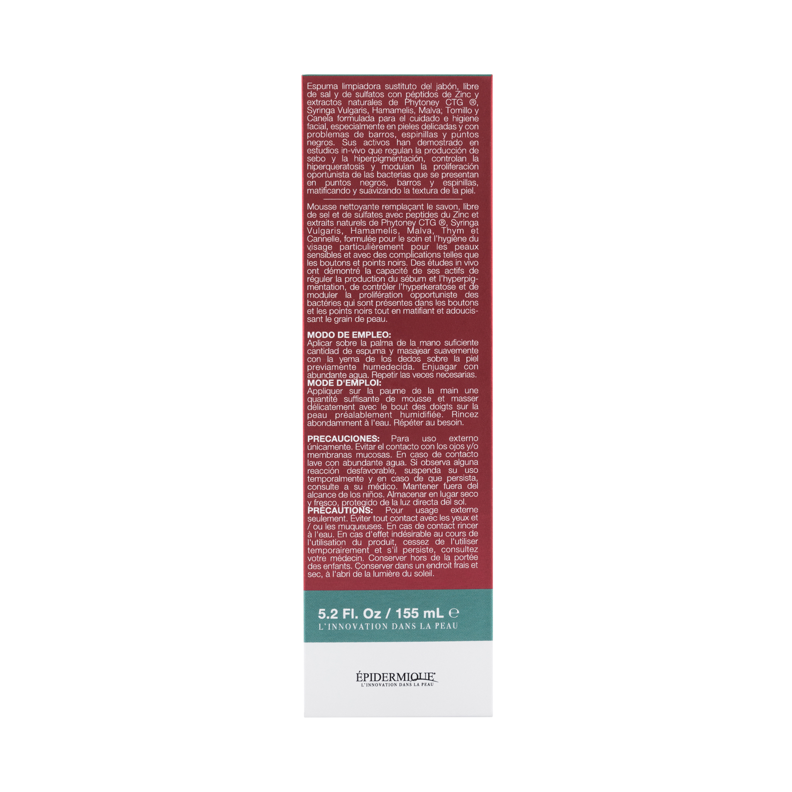 Espuma limpiadora sustituto del jabón, libre de sal y de sulfatos con péptidos de Zinc y extractos naturales de Phytoney CTG ®, Syringa Vulgaris, Hamamelis, Malva, Tomillo y Canela formulada para el cuidado e higiene facial, especialmente en pieles delicadas y con problemas de barros, espinillas y puntos negros. Sus activos han demostrado en estudios in-vivo que regulan la producción de sebo y la hiperpigmentación, controlan la hiperqueratosis y modulan la proliferación oportunista de las bacterias que se presentan en puntos negros, barros y espinillas, matificando y suavizando la textura de la piel.